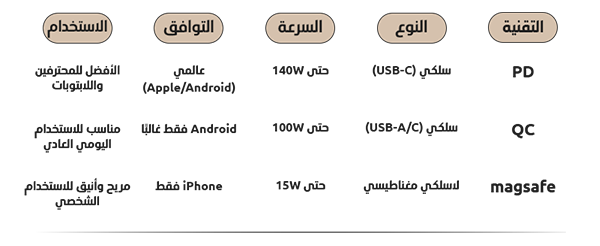 في النهاية، سواء كنت تبحث عن أسرع شاحن PD أو شاحن MagSafe أو باوربانك متنقل، السر في الاختيار الذكي هو فهم التقنية قبل الشراء والذي يعتمد على أسلوب استخدامك, فإن كنت تبحث عن القوة، فاختر PD. وإن كنت تفضّل الراحة والأناقة، فـ MagSafe هو خيارك المثالي. ويفضل البحث عن اجهزة توفر جميع هذه التقنيات.