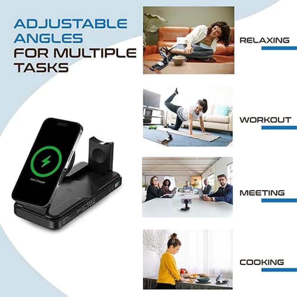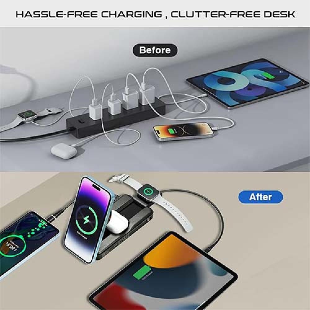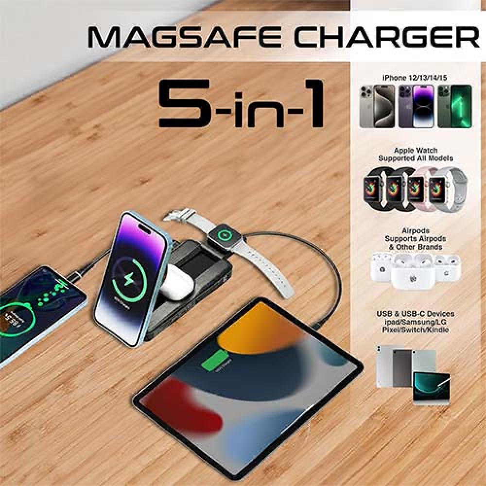 - حل شحن 5 خيارات شحن في 1: MagSafe للهاتف، وشحن لاسلكي للساعة والسماعة، USB-C PD، وUSB-A QC 3.0