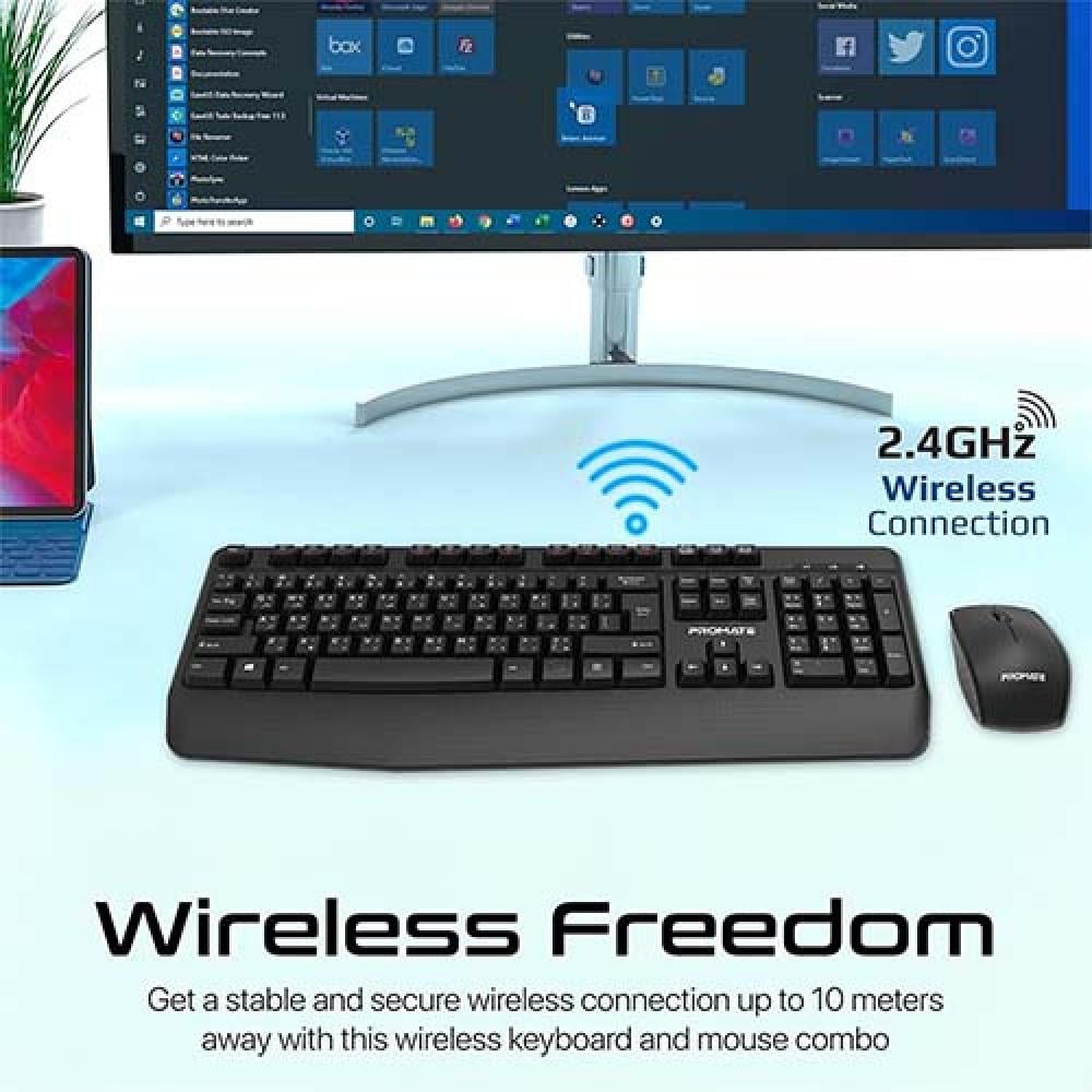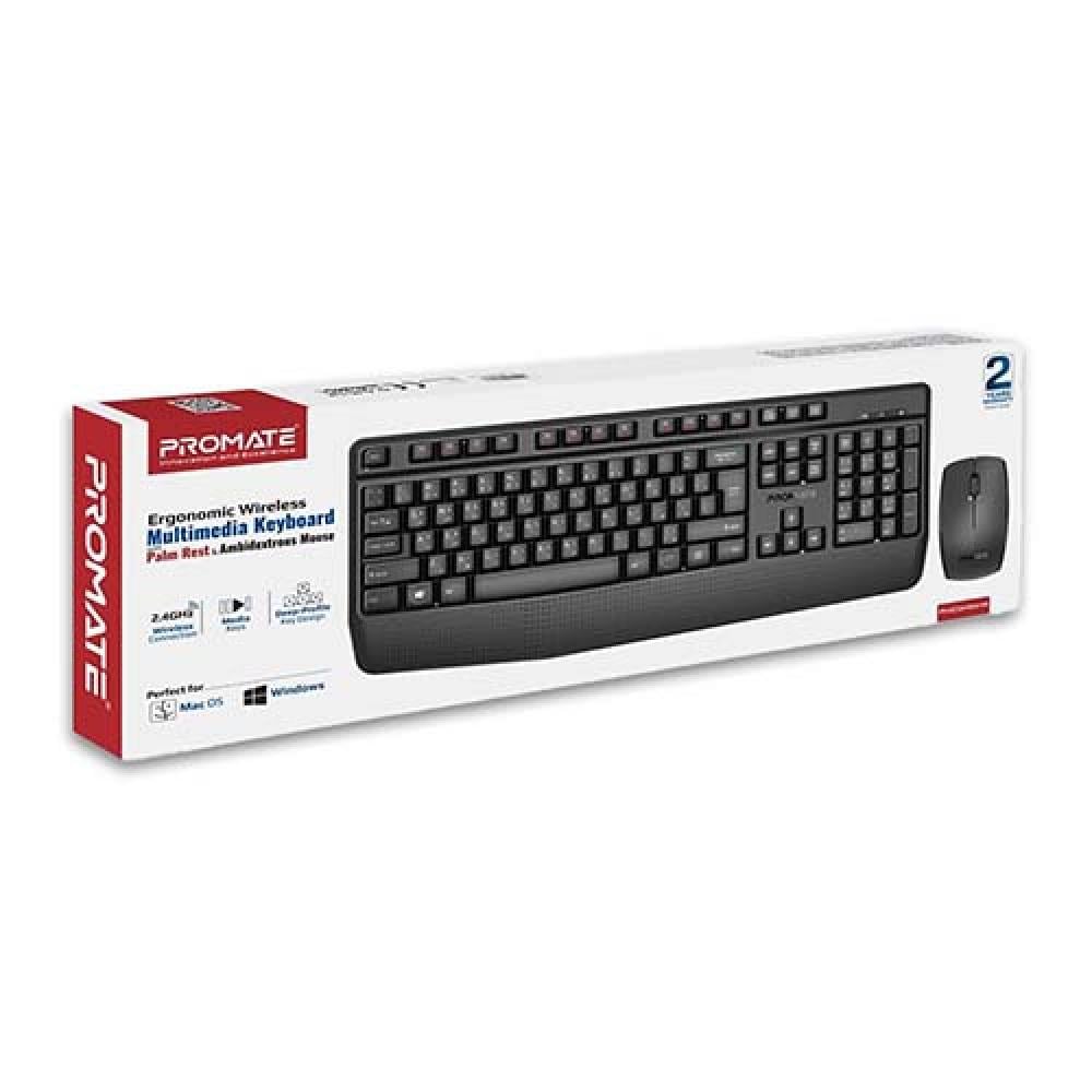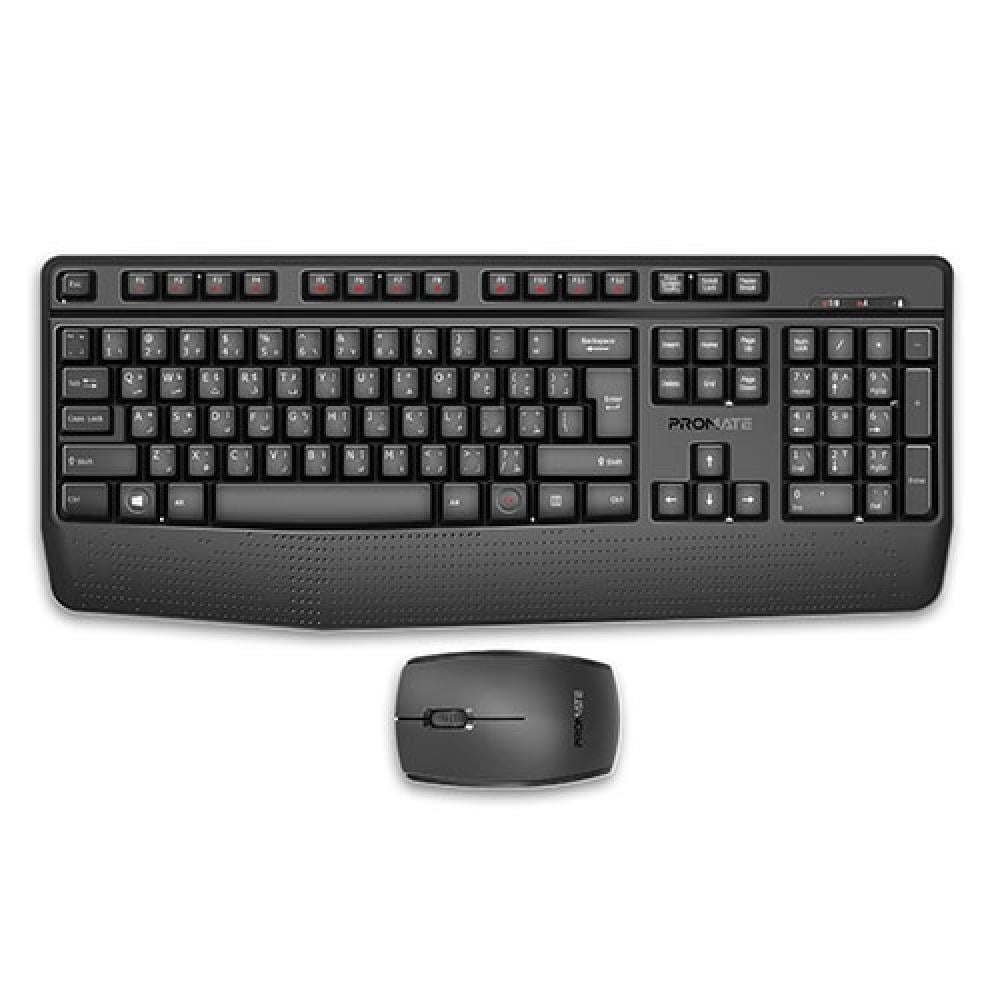 مجموعة لوحة مفاتيح وفأرة لاسلكية Promate ProCombo-14 | اتصال 2.4 جيجاهرتز، تصميم عربي وإنجليزي، باللون الأسود.